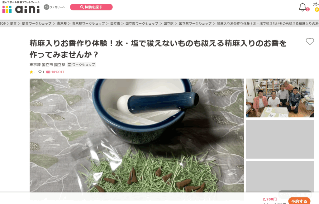 精⿇⼊りお⾹作り体験は、aini からお申し込み頂けます。開催場所・⽇程等のリクエストも承ります。
